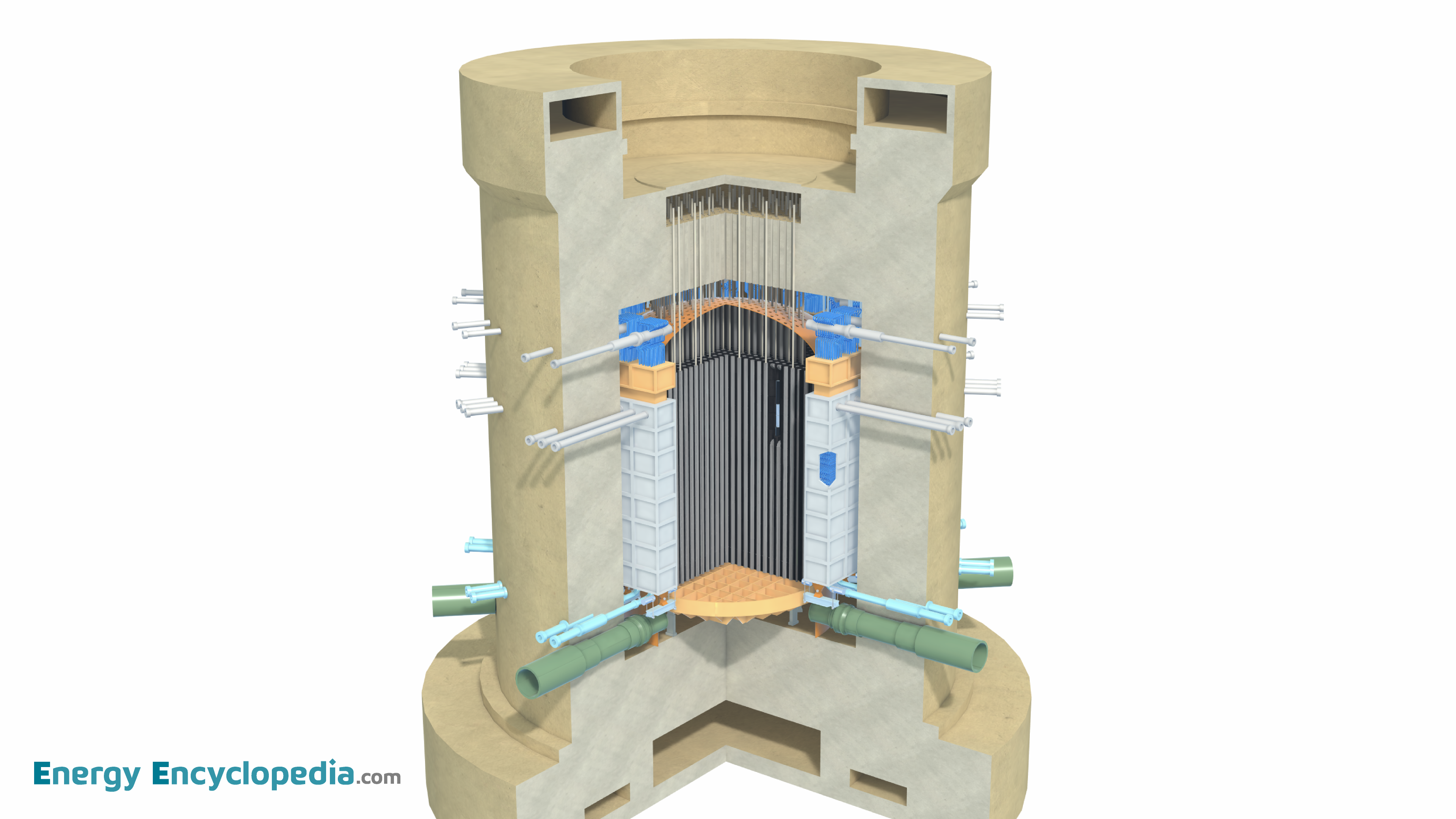 Cutaway view of an AGR nuclear reactor with a graphite core and CO2 cooling system housed in a prestressed concrete pressure vessel.