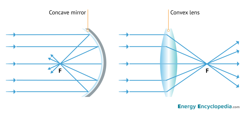 Rays converging into the focal point (F) in a concave mirror (left) and a convex lens (right).