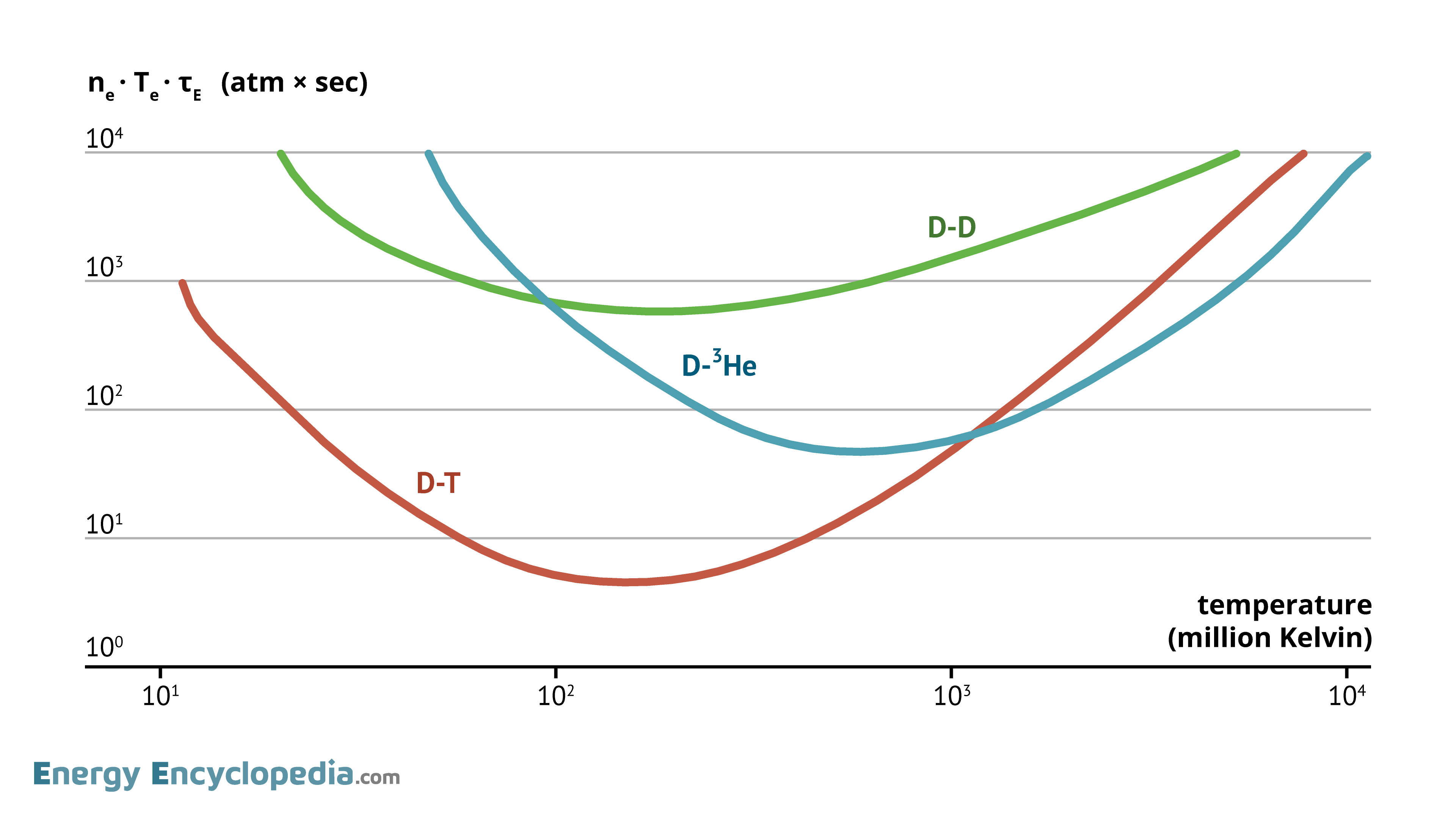 The graph shows the required fusion triple product (ne·Te·τE) as a function of temperature for various fusion fuels.