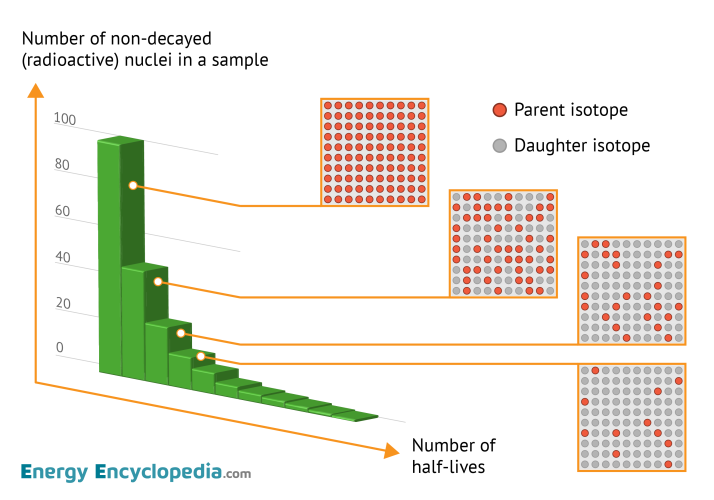 A graph showing how the amount of a radioisotope decreases during its several half-lives.