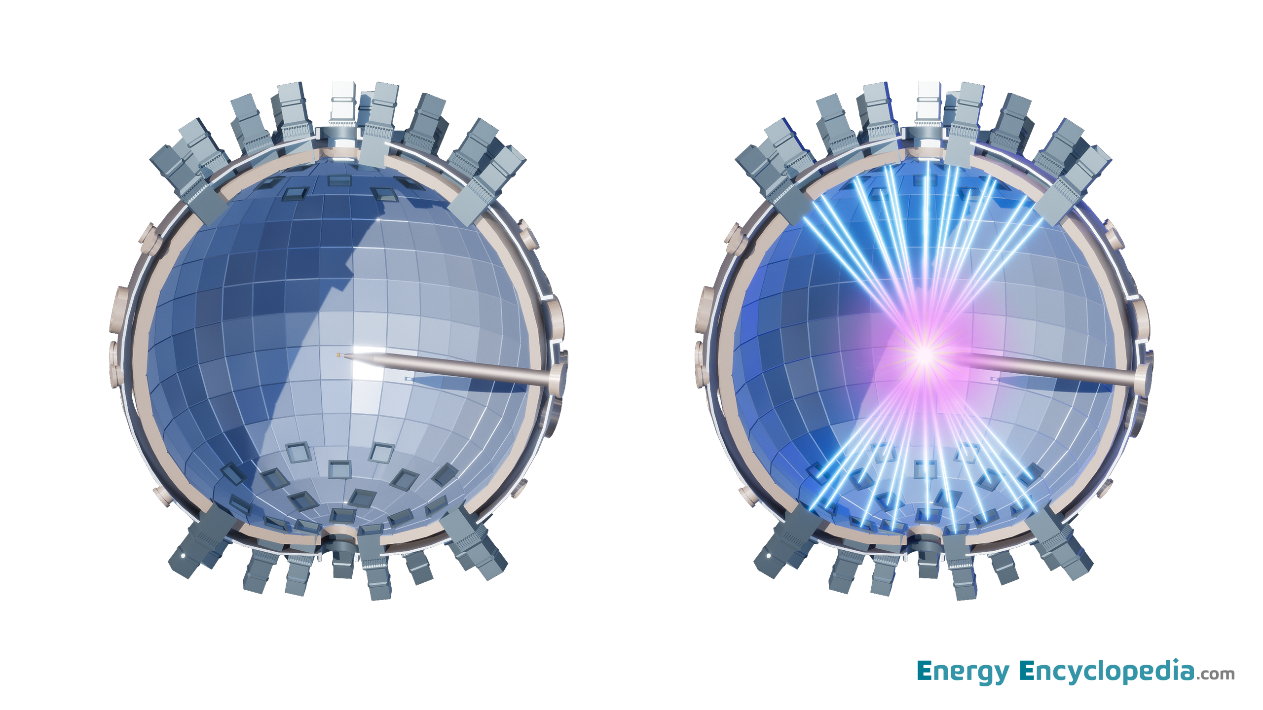 Laser driven fusion chamber and the process of pellet compression by laser beams (right).