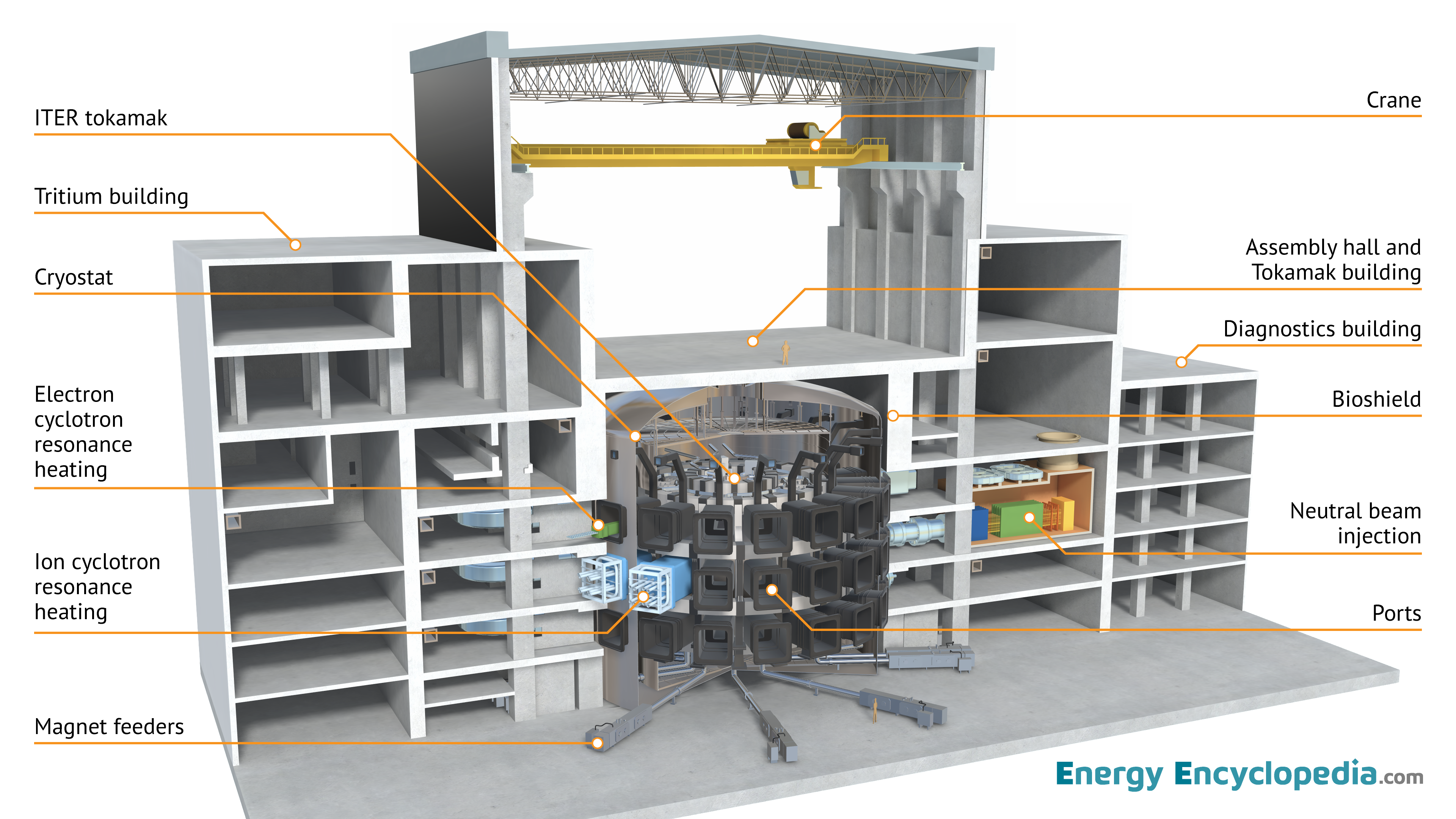 Cutaway view of the ITER fusion facility, illustrating the overall layout and the integrated systems used for magnetic plasma confinement and experimental fusion operation.