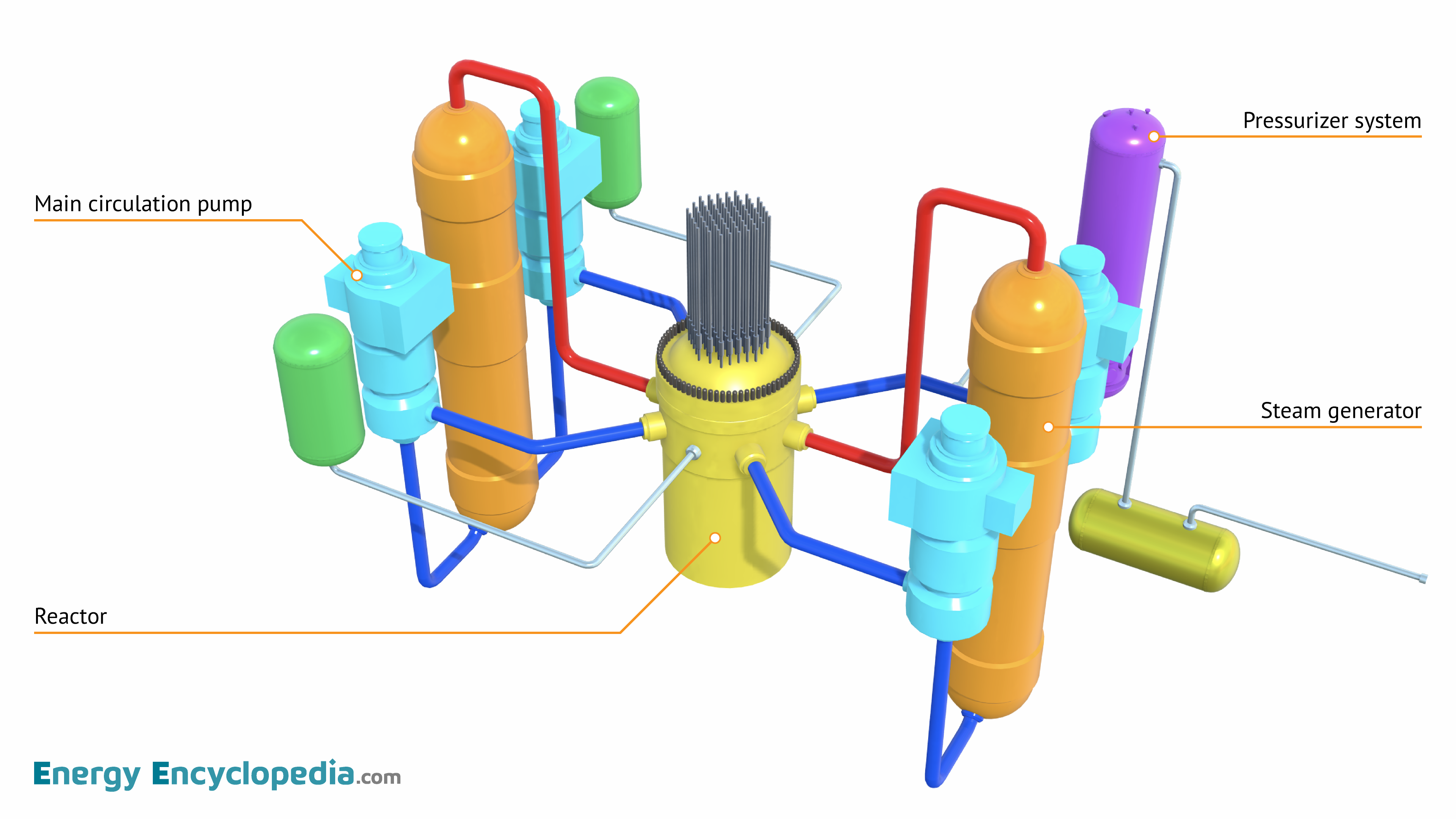 Labelled schematic of the primary coolant circuit of the PWR nuclear power plant at Three Mile Island, the site of the first major nuclear accident.