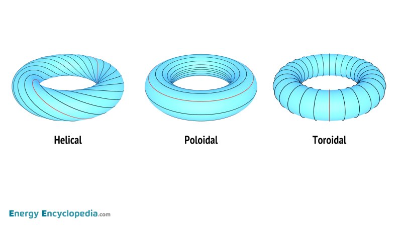 Drawing of magnetic field lines in the toroidal chamber. From left to right: helical, poloidal, toroidal.