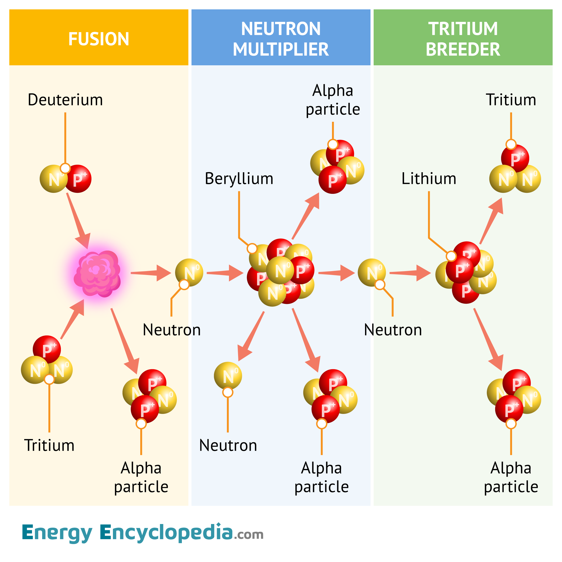 Fusion fuel cycle showing D-T fusion, neutron multiplication in beryllium, and tritium breeding in lithium.