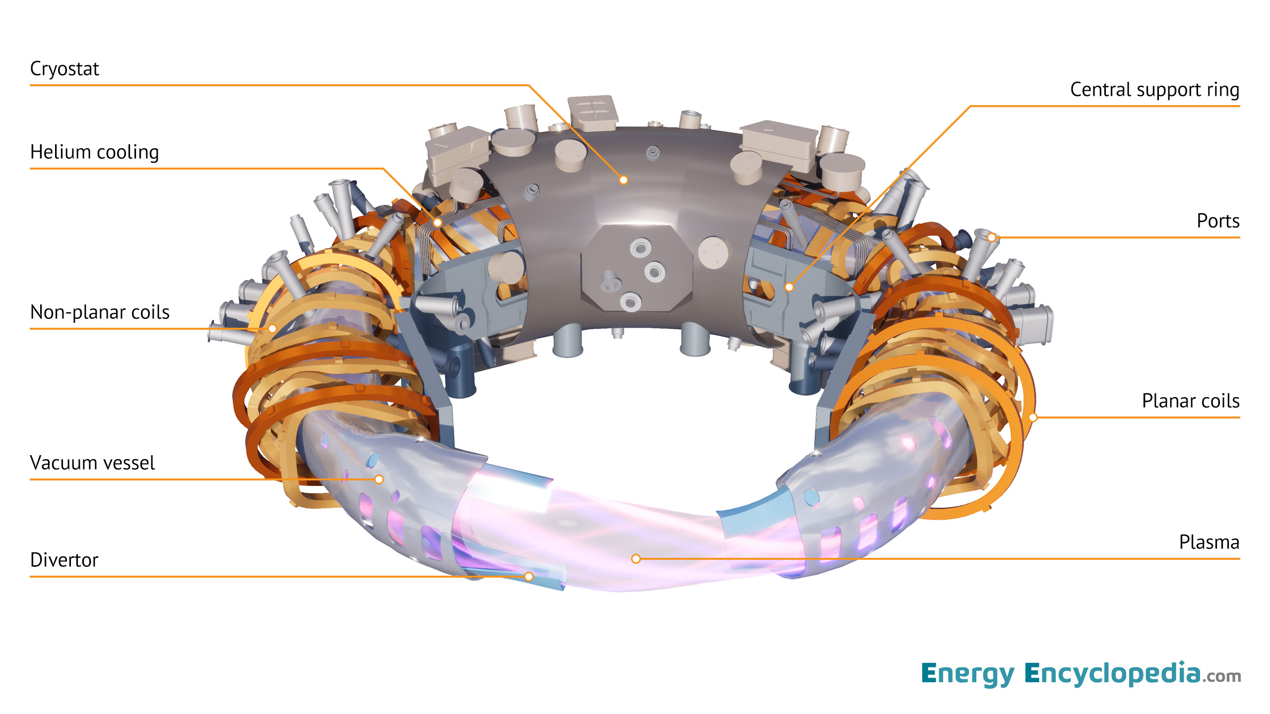 A stellarator is a type of magnetic confinement device for thermonuclear fusion in which the confining magnetic field is generated entirely by external coils — that is, without relying on a plasma current. The name derives from the idea of a “generator of stellar energy”. Stellarators offer the potential for continuous, steady-state operation, a key advantage over tokamaks, which operate in pulsed modes.